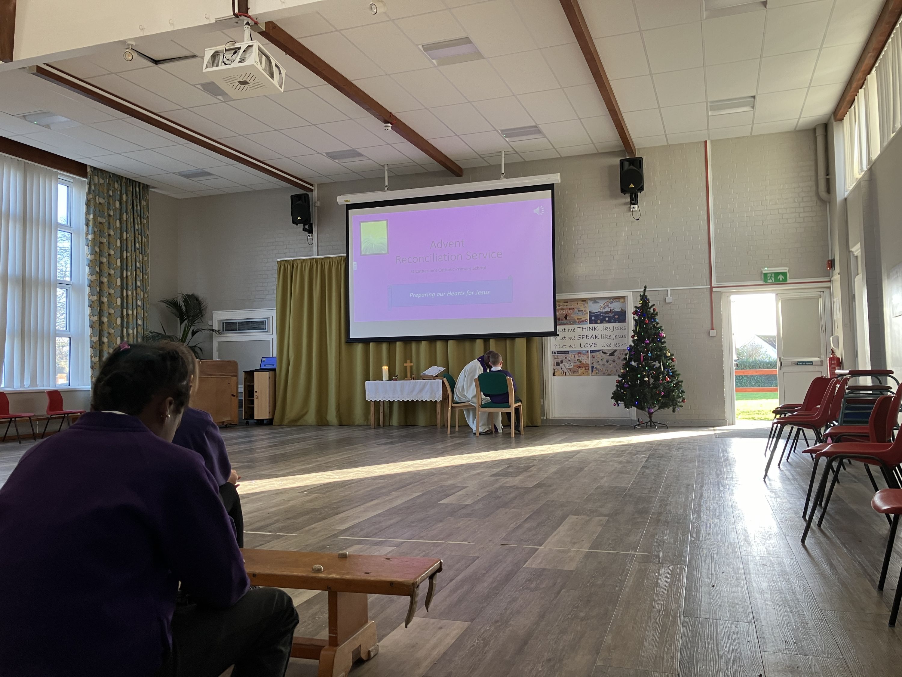 Fr Boniface joined us for Reconciliation yesterday. In our service to the whole school, we discussed that in Reconciliation, Jesus helps us wipe away anything that keeps his light from shining in us. The light that lit up the hall through the doorway helped pupils keep this clearly in their minds as they waited for their time with Fr Boniface.